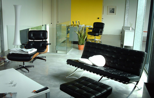 In the foreground we have the very popular Barcelona two seater sofa and Barcelona Ottoman in black full aniline Italian leather. To the left is the Eames Lounger and Ottoman in rosewood veneer. Cushions covered in full aniline Italian leather. In the background sits the Eames Lobby chair